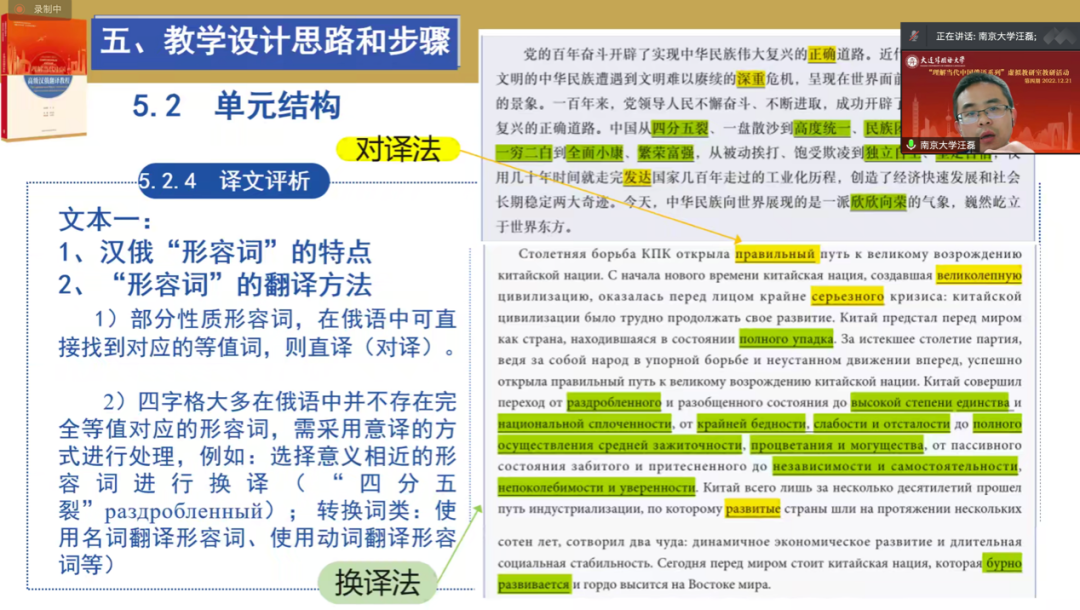 本期教研活动围绕《理解当代中国:高级汉俄翻译教程》展开,旨在帮助任课教师深入理解教材编写理念,准确把握教材核心内容,充分交流教学方法,切实提高教材使用实效。活动由《理解当代中国:高级汉俄翻译教程》副主编、南京大学王加兴教授主持,《高级汉俄翻译教程》编者、南京大学汪磊教师进行示范说课。来自虚拟教研室成员高校和国内其他高校的教师、外研社综合语种教育出版社的领导和编辑以及我校69书吧