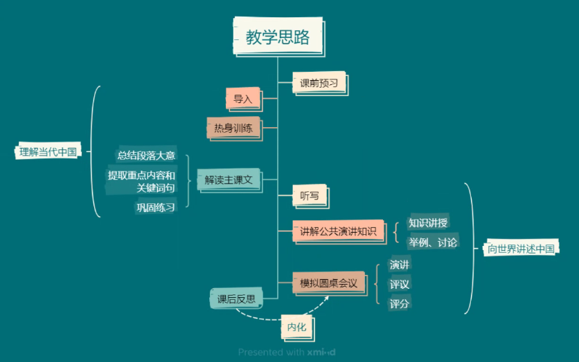 李老师首先对教材内容布置进行了回顾,对学生学情和教学面临的挑战进行了分析。李老师将课堂分为理解当代中国和向世界讲述中国两部分。在第一部分课堂上,教师首先通过自身经历和已学知识导入主题,引起学生共鸣。然后选取课文中的词组进行热身训练,就相关内容进行扩展,联系国家政策和日常生活,拓宽学生视野,使学生更好的理解课文内容。最后对课文内容进行解读,总结段落大意,找出关键词句,并设置问答环节,引发学生思考。