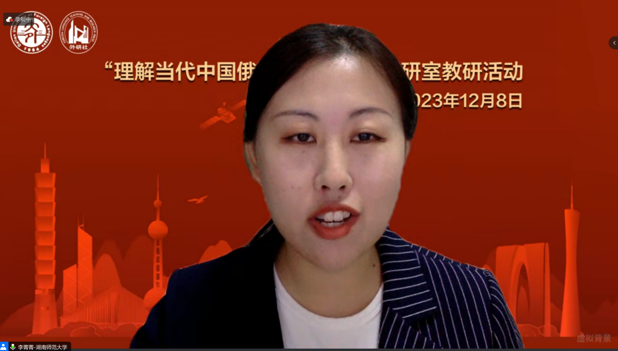 本期教研活动由湖南师范大学外国语学院俄语系主任何冰琦主持。何冰琦老师首先介绍了《理解当代中国:俄语演讲教程》的课程建设、教材特点、示范课交流分享等相关情况,并对本次教研活动的主讲人湖南师范大学李菁菁老师进行了简要介绍。