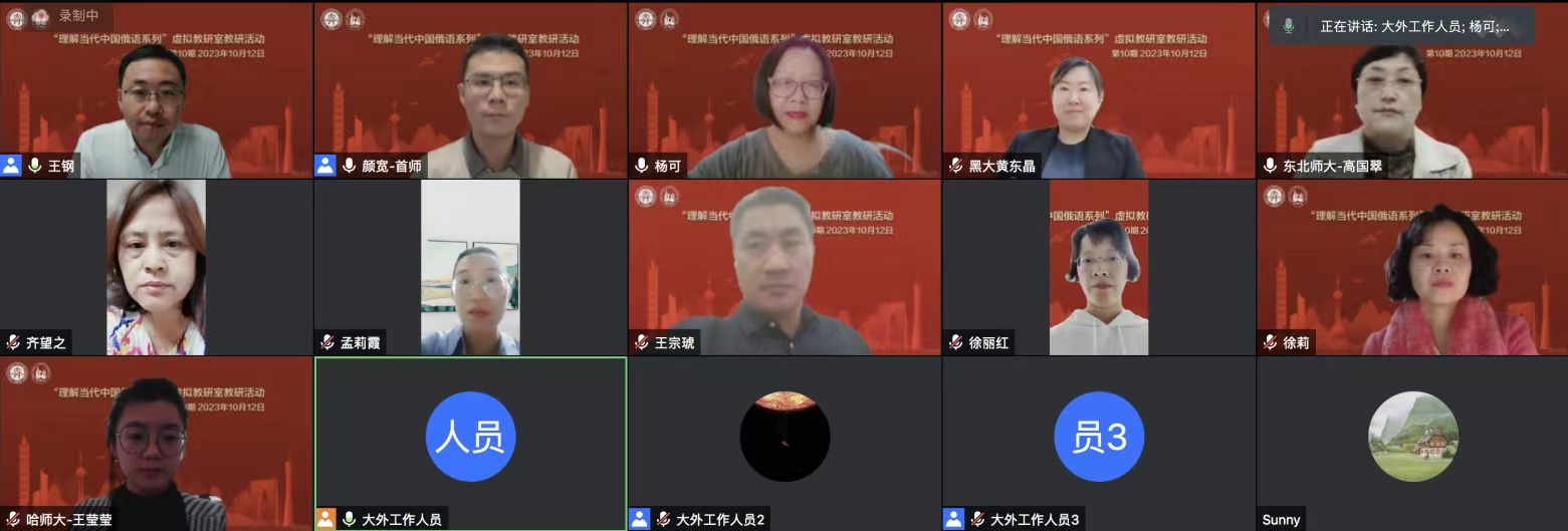 2023年10月12日19点,由我校刘宏教授主持的教育部“理解当代中国俄语系列”虚拟教研室2023秋季学期教研活动第十期在云端成功举办。来自虚拟教研室成员高校及其他高校的教师、外研社综合语种教育出版社的领导、编辑以及我校69书吧