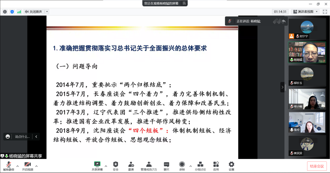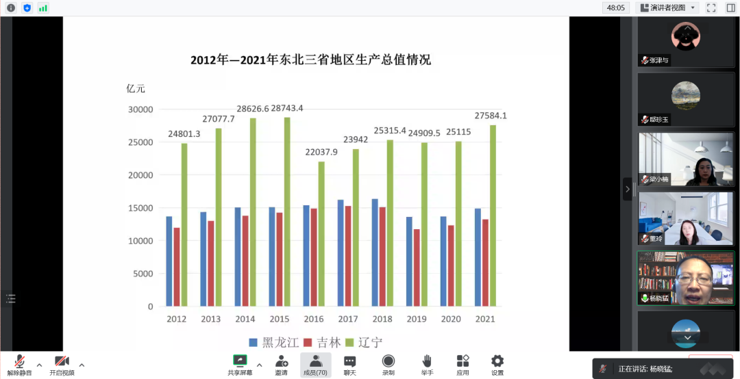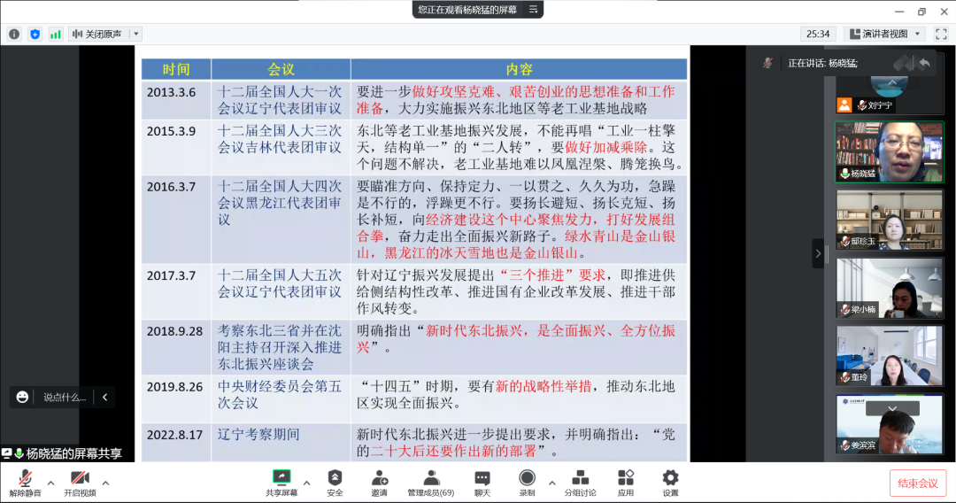 杨晓猛教授认为,习近平总书记的重要讲话精神体现了对东北、对辽宁的亲切关怀和大力支持,进一步坚定了加快推进振兴发展的信心和决心;明确了新时代东北振兴的历史使命,为大连全面振兴、全方位振兴指明了方向;深刻阐述了新时代东北振兴的实践要求,为大连振兴发展提供了科学方法。在对东北振兴发展的回顾中,杨教授以图表形式直观呈现东北这十年来各方面发展情况。她提出要坚持“问题导向”、“目标导向”、“结果导向”相统一,在最关键、最紧迫、最重要的地方和节点精准发力、攻坚克难,把落实总书记关于全面振兴的总体要求转化为实际行动。