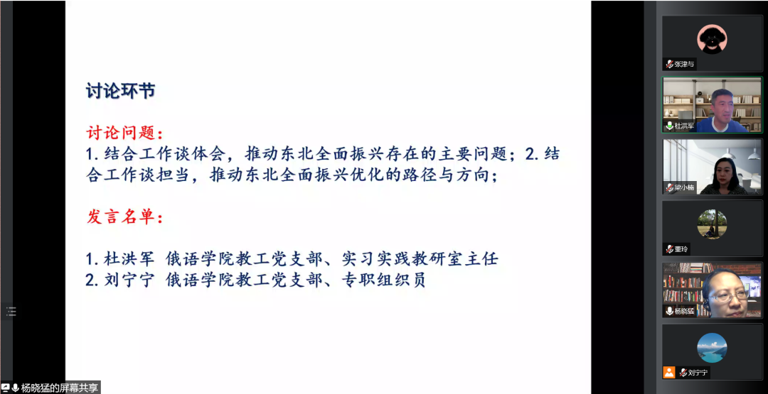 教工党支部的杜洪军和刘宁宁两位老师积极分享了他们的学习体会。通过党课的学习,杜洪军老师对东三省的发展有了整体认识,东北地区作为“共和国长子”,为中国的发展做出巨大贡献。他鼓励学生作为新时代青年,在中俄关系蓬勃发展的背景下,应当抓住有利机遇,以饱满的精神状态与责任担当,贡献青年的力量。刘宁宁老师结合工作,从党建引领和立德树人的角度进行分享,她表示要以总书记关于东北振兴的重要思想为指引,在振兴发展中更好的发挥党组织战斗堡垒作用和党员先锋模范作用,更好的担起学生健康成长指导者和引路人的责任,努力为振兴发展提供坚强组织保证。