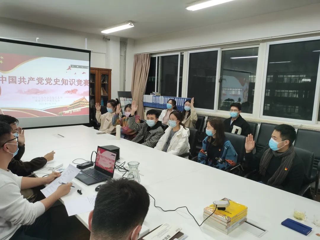 会议的第二项内容是《中国共产党党史知识竞赛》,采用线上线下党员学生抢答的形式举行。本环节由大学生西部计划优秀志愿者邵宏第主持,共建党支部国际交流与合作处党支部为学生们准备了精美的奖品,同学们积极参与,现场气氛活跃。