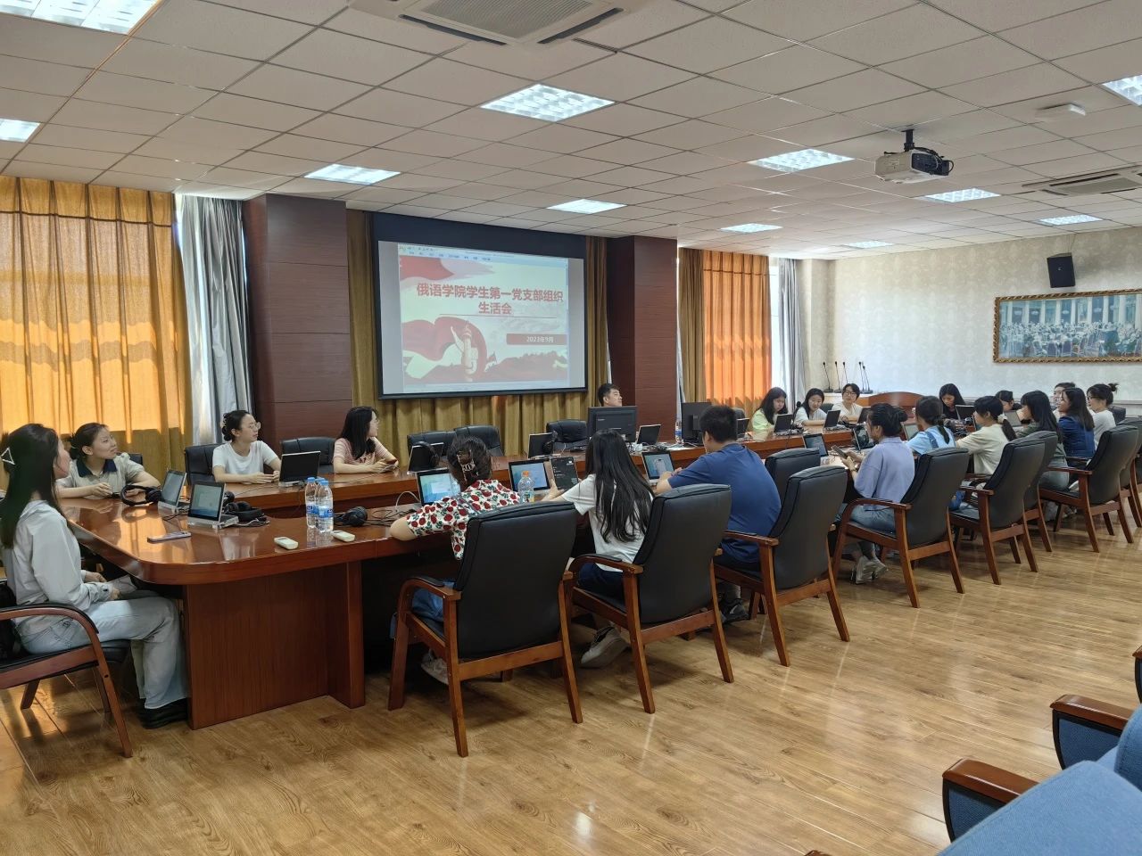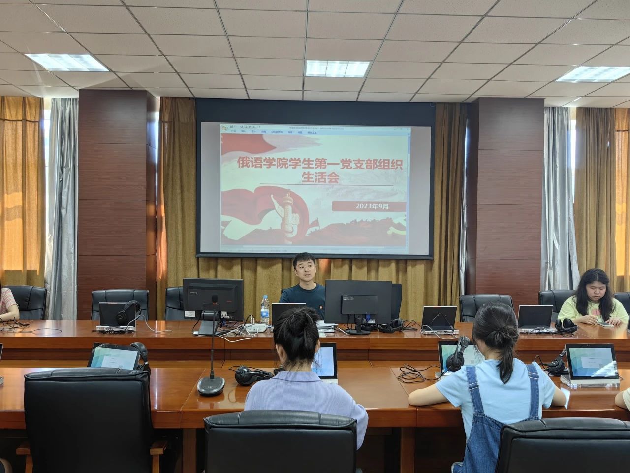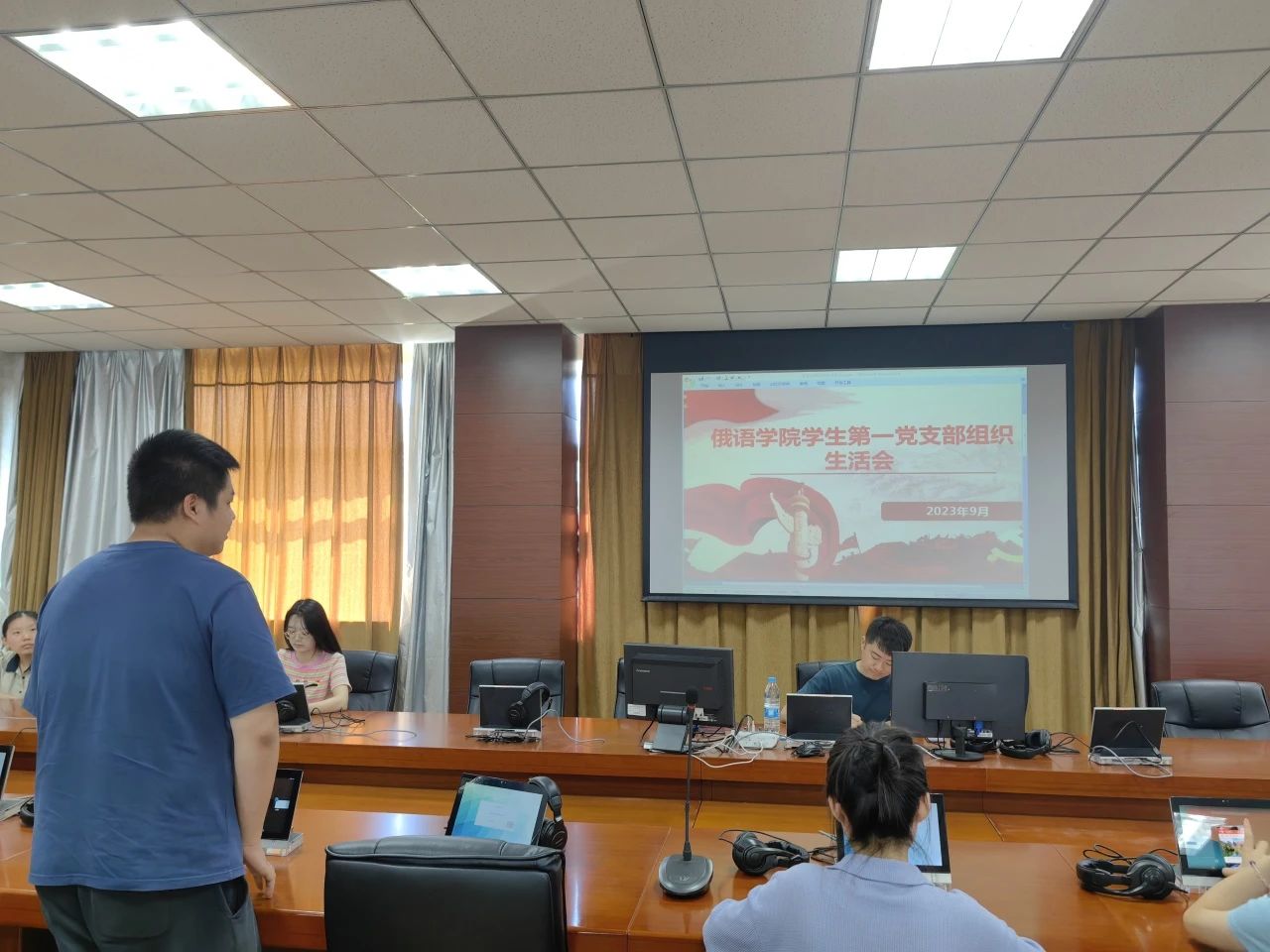 学生第一党支部在口译实验室召开了学习贯彻习近平新时代中国特色社会主义思想主题教育专题组织生活会暨9月份党日活动,会议由支部书记王健主持,全体党员参会。