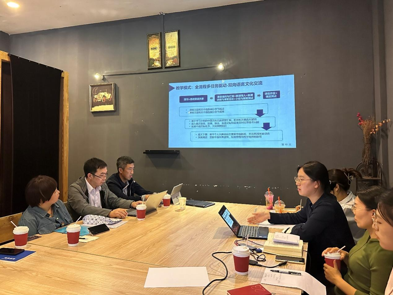 随后,四位省级一流课程教师代表进行了示范课展示。鲁速老师以《国际商务俄语口译》课程为例,重点示范商务询盘与报价谈判的口译过程教学。刘铁妹老师以《中国文化(俄语)》课程为示范,从中俄文化对比的角度讲述了影片《长安三万里》、诗歌《静夜思》中的文化精神。王野老师重点示范《中级俄语综合课2》的教学设计和建设计划,提出理解外语课程思政的教育政策、课程理论和课程特点三个维度。王楠楠老师以《初级俄语综合课》的“双向语言文化交流+数字人文融合”教学创新为重点,从课程概况、学情分析、教学目标、教学理念等方面进行了深度讲解。