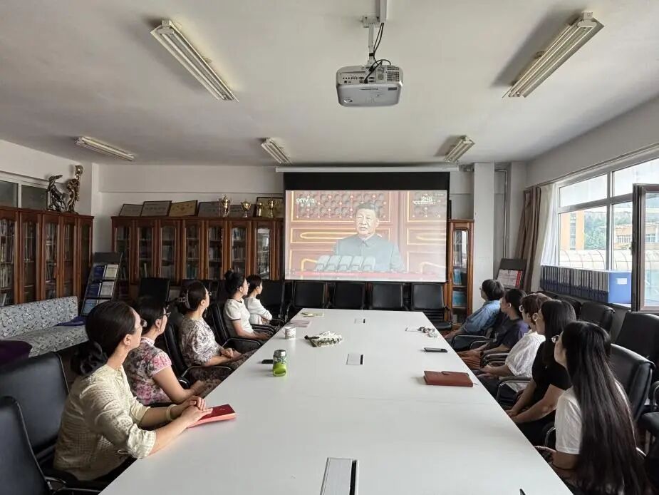 学生第二党支部书记美合日古丽带领全体学生党员集体收看纪念中国人民抗日战争暨世界反法西斯战争胜利80周年大会盛况,大家全神贯注聆听习近平总书记重要讲话。学生党员一致认为,习近平总书记重要讲话高屋建瓴、振奋人心,宣示了中国人民铭记历史、捍卫和平的坚定意志。受阅部队步履铿锵、气势如虹,多款新型主战装备首次亮相,集中展示了新时代国防和军队建设的恢宏成就,彰显了中国维护国家主权、安全和发展利益的钢铁意志与硬核实力。在交流环节,学生党员们纷纷表示,要铭记历史,弘扬伟大的抗战精神,以实际行动践行爱国情怀,为实现中华民族伟大复兴的中国梦而努力奋斗。