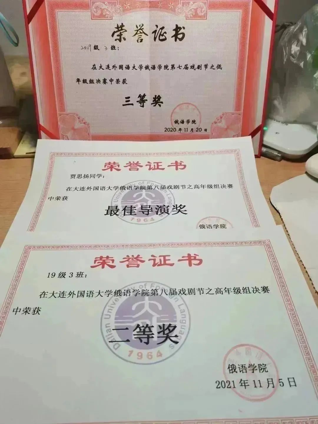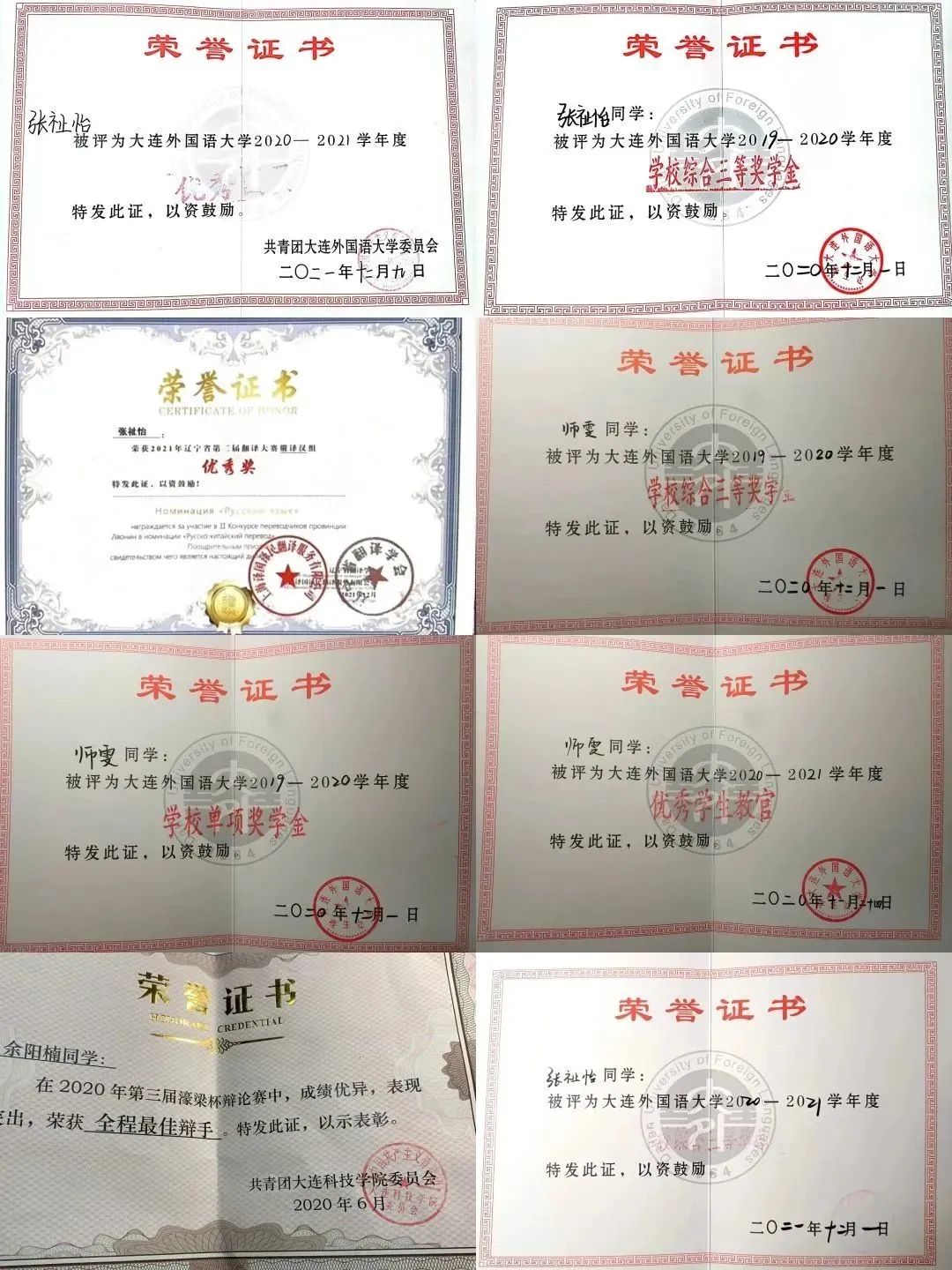 校友基金”奖助学金,国家奖学金,辽宁省政府奖学金和校级奖学金,2名班级成员曾担任学生会主席团成员职务,4人担任2021级以及2022级班导生,3人荣获2021年中俄政府奖学金项目公派留学名额。