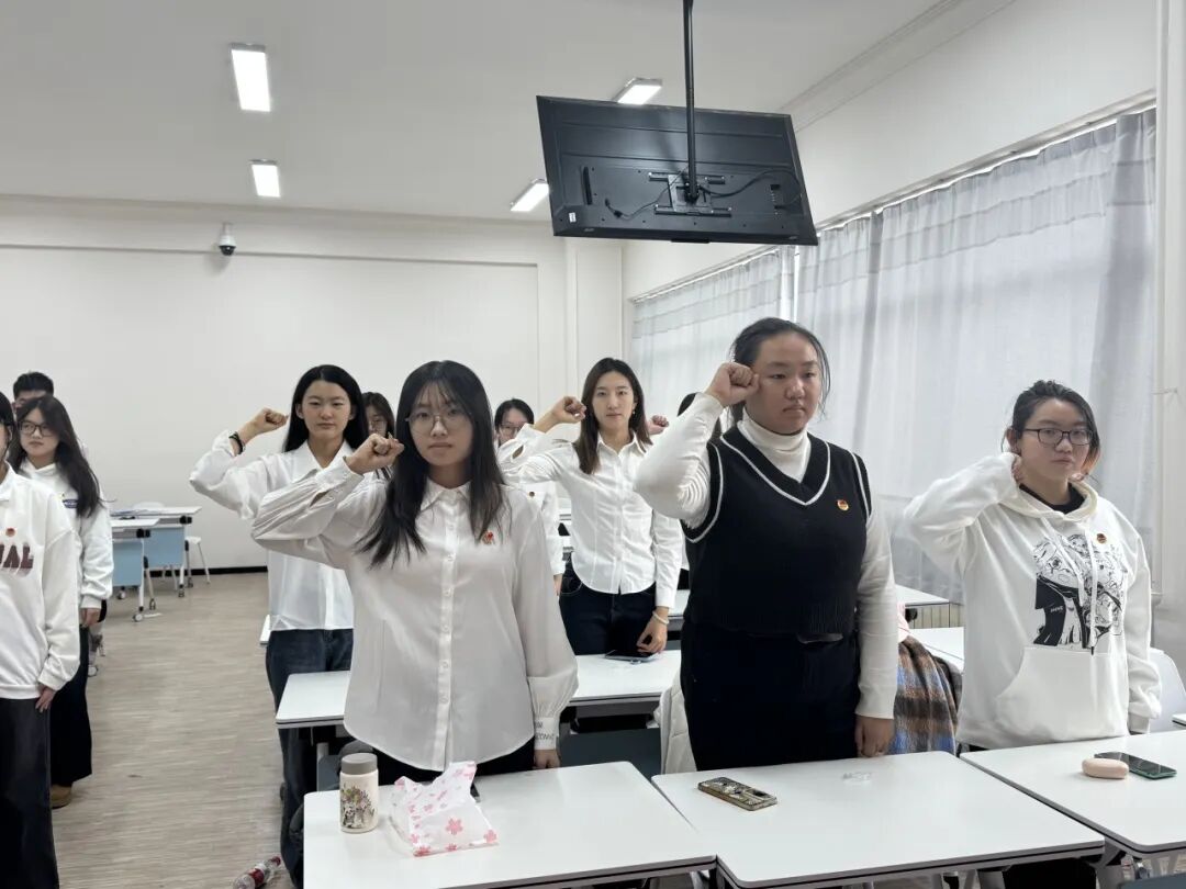 而后,新团员们分别佩戴团徽,廖嘉炜同学向新团员们讲述团旗的代表意义,带领新团员们宣读入团誓言,并向新团员们讲述了《团章》第一章第二条和第三条,帮助新团员们更好理解并履行团员的义务、更好享有团员的权利。随后进行了新团员发言环节,新团员们分享了自身的入团动机以及自身的理想和奋斗目标。