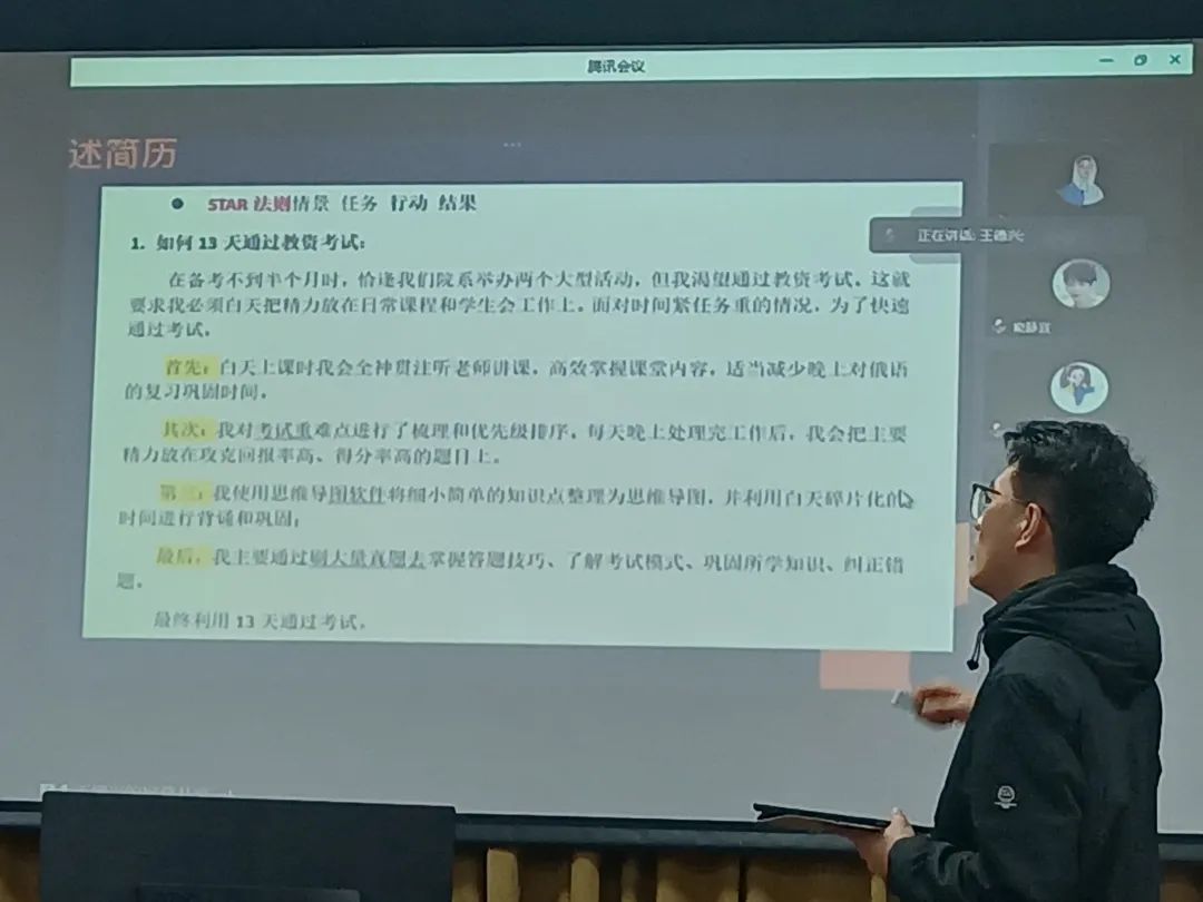 你以为面试官开始向你问问题才是面试的开始?No!从你进入面试官视线的那一刻起,面试就已悄然开始。如何把握每一分钟展示自己?如何沉着应对纷繁复杂的各种面试情况?王德兴同学首先带大家明确了面试的各种类型,以及不同类型面试的主要形式和考察内容。之后他结合自己的面试经历指出了面试中值得注意的问题,并且从面试前、中、后三个阶段为同学们提出建议。他表示面试前要做好准备工作,明确岗位JD,做到心中有数。面试中要有逻辑且灵活的表达观点,主动但不过度的展示自己。面试后则应快速复盘,积累经验。综上所述的各种面试知识点都能帮助同学们备豫不虞,有效化解职场“面试难”。