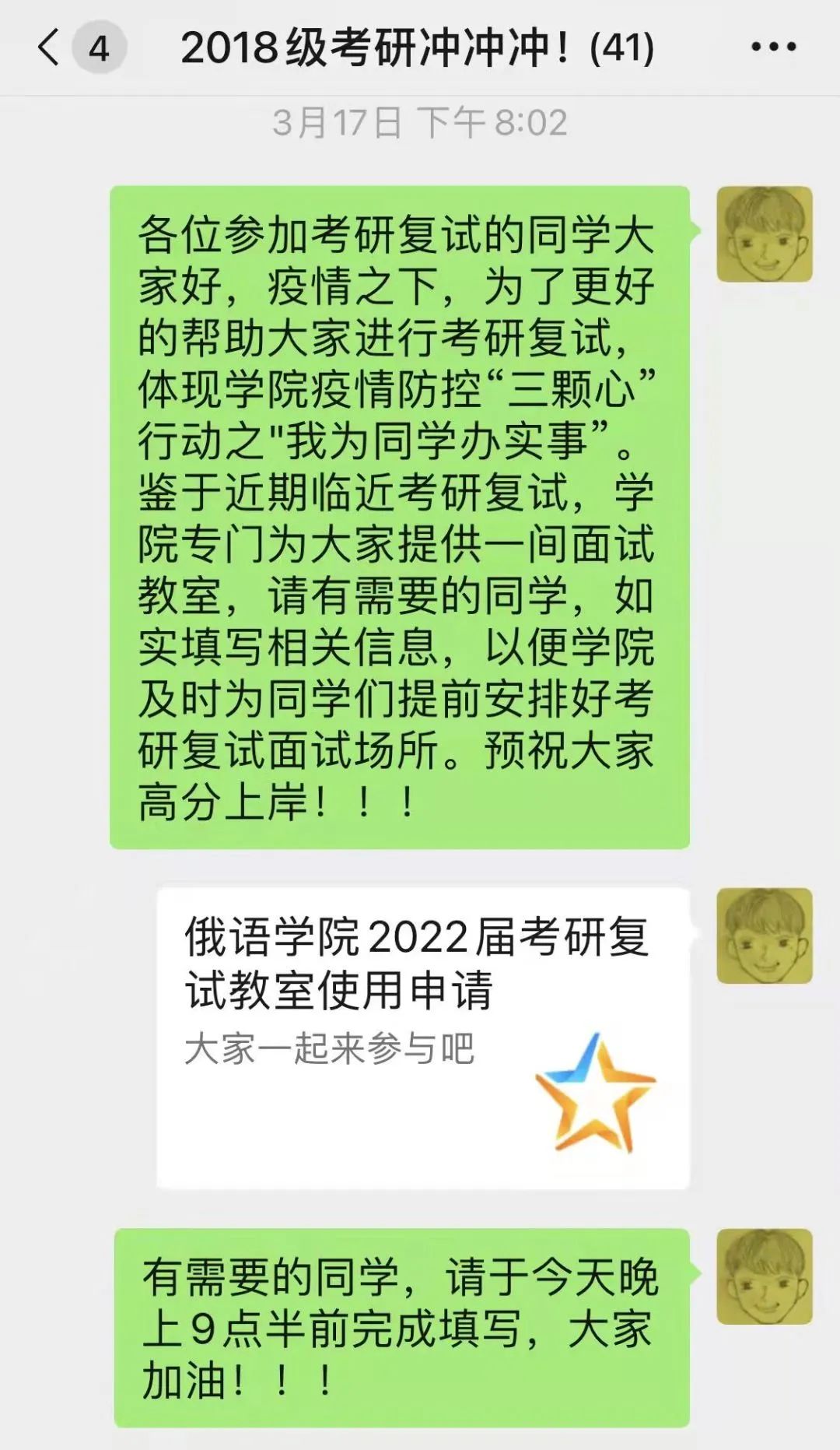 口译实验室、学院资料室、党员活动室、俄语中心、哈萨克斯坦研究中心、亚美尼亚研究中心等6个教室作为考研复试、就业面试专用教室。活动得到了上合组织大学中方校长办公室的大力支持,同时也得到了学院任课教师的大力支持,老师们表示“如有需要,可将自己办公室作为考研复试、求职面试同学们的专用教室”助力同学圆梦!