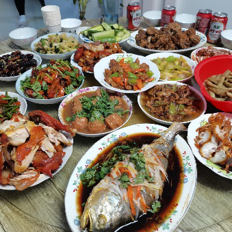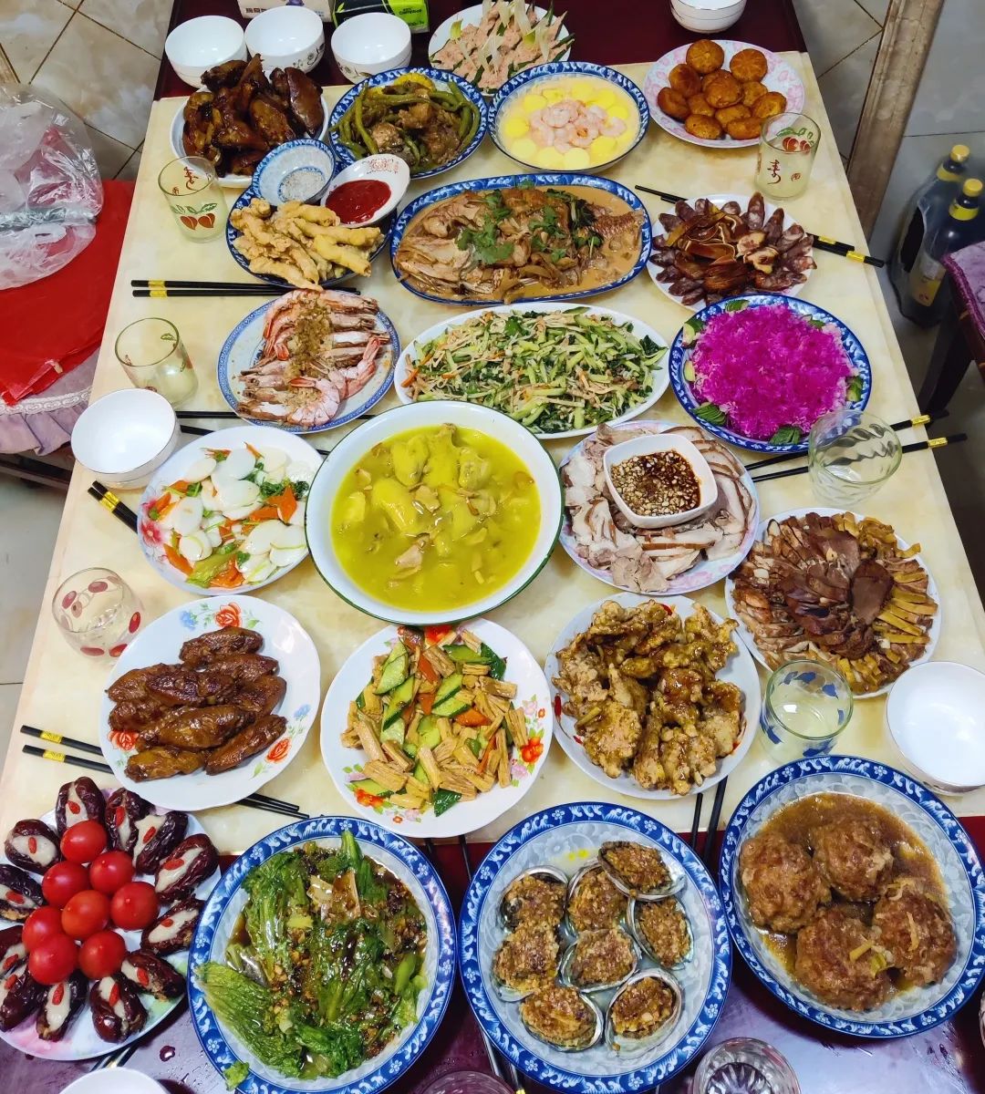 在我的家乡龙城辽宁朝阳,团圆饭中有很多必不可少的传统菜肴,寓意着“年年有余”的红烧鱼;代表着“吉祥如意”的鲜鸡汤……东北人爱吃的蚕蛹也在年夜饭桌上承担着特别角色,意为“春之发育”。除夕宴上一家人围坐桌前聊家事、展新年就是最最幸福的时刻。