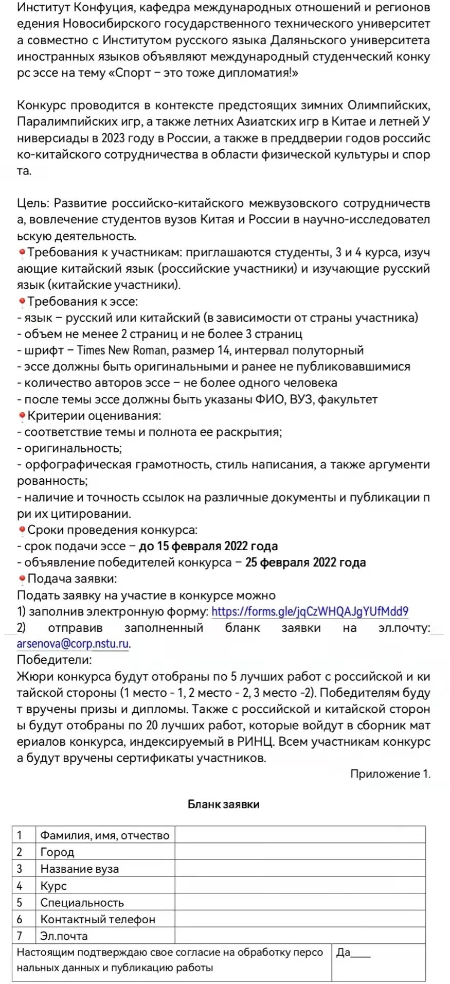 特联合新西伯利亚国立技术大学孔子学院举办以《体育也是一种外交》为主题的国际大学生征文比赛,共话中俄体育,共叙中俄友情。