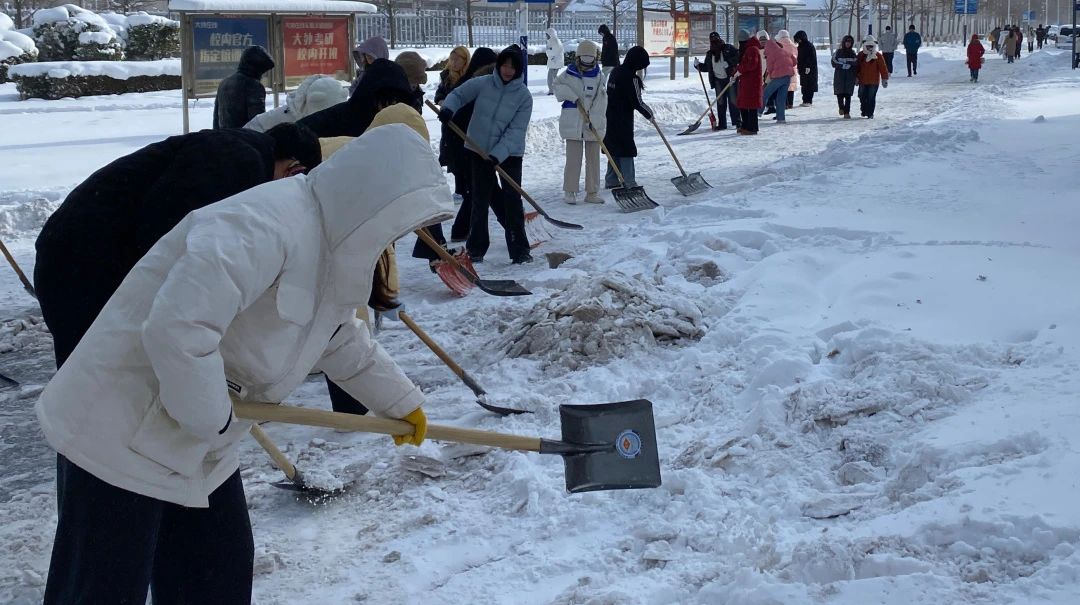 同学们冒着寒风,拿起除雪工具,积极踊跃的加入除雪队伍中。雪厚冰坚,同学们齐心协力的在雪中奋战,路上的积雪与薄冰渐渐被打扫干净,“安全通道”被清理出来,保障了师生的出行安全。