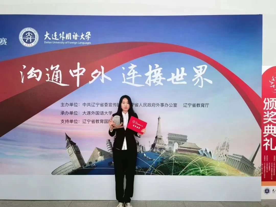 俄语专业 2020 级本科⽣,⼤连市优秀毕业⽣,任新⽣班导⽣,专业及综合排名均为专业第⼀,曾获国家奖学⾦、校综合奖学⾦、国家留学基⾦委“中俄政府奖学⾦”公派留学名额、2021 年全国⾼校俄语⼤赛低年级组冠军、2023 年全国⾼校俄语⼤赛⾼年级组⼆等奖,2023 年“辽沈最美翻译官”冠军,辽宁省“挑战杯”全国⼤学⽣创业计划竞赛三等奖项,以第⼀名的成绩推免⾄南京⼤学攻读俄语语⾔⽂学硕⼠研究⽣学位。