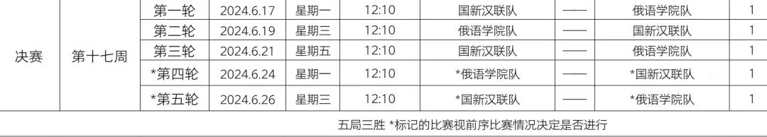 总决赛采用五局三胜制,具体赛程如下图,在此希望全体俄院团结一致,中午12点10分准时在风雨操场,为我们自己的球队加油,呐喊,期待我们球队再创佳绩!