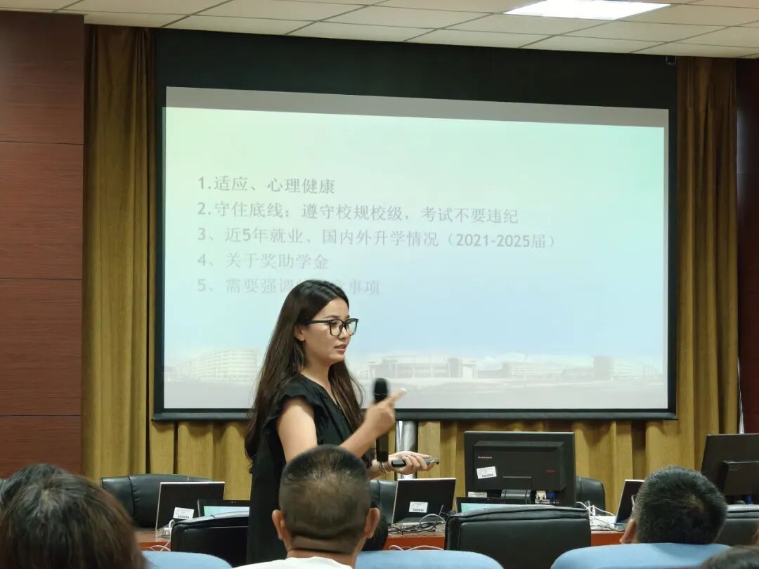 新生家长会圆满结束后,励学楼口译实验室随即召开2025级新生见面会,2025级全体新生全员到场,新生辅导员美合日古丽·喀哈尔、班导生代表及军训教官共同出席,为新生清晰梳理后续校园生活与军训安排。会上,美合日古丽·喀哈尔重点强调组织纪律,从课堂出勤的基本要求、集体活动的参与规范,到宿舍安全的注意事项逐一说明,同时贴心提醒新生,遇到适应难题或生活困惑时,可随时与辅导员、班导生沟通;军训教官则结合实际训练计划,明确后续安排,并着重强调军训着装需统一整洁、训练期间不得迟到早退、身体不适要及时报告等要求,切实为新生顺利融入集体、开启军训生活保驾护航。