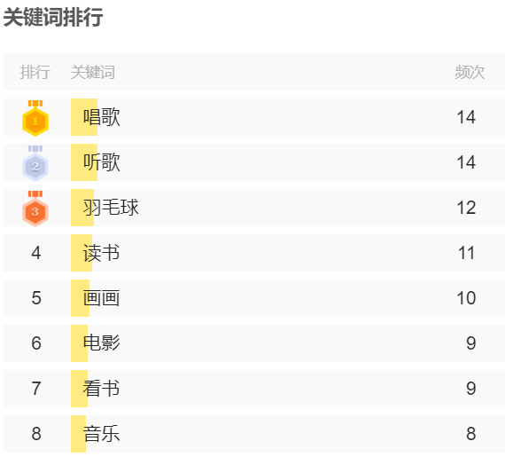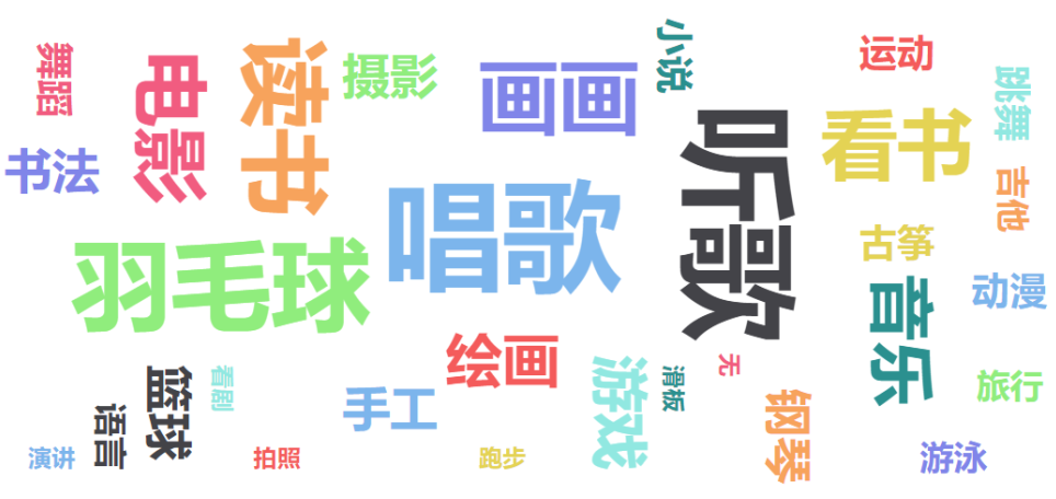“兴趣爱好”中“唱歌”“听歌”“羽毛球”是2022级萌新最为喜欢的。