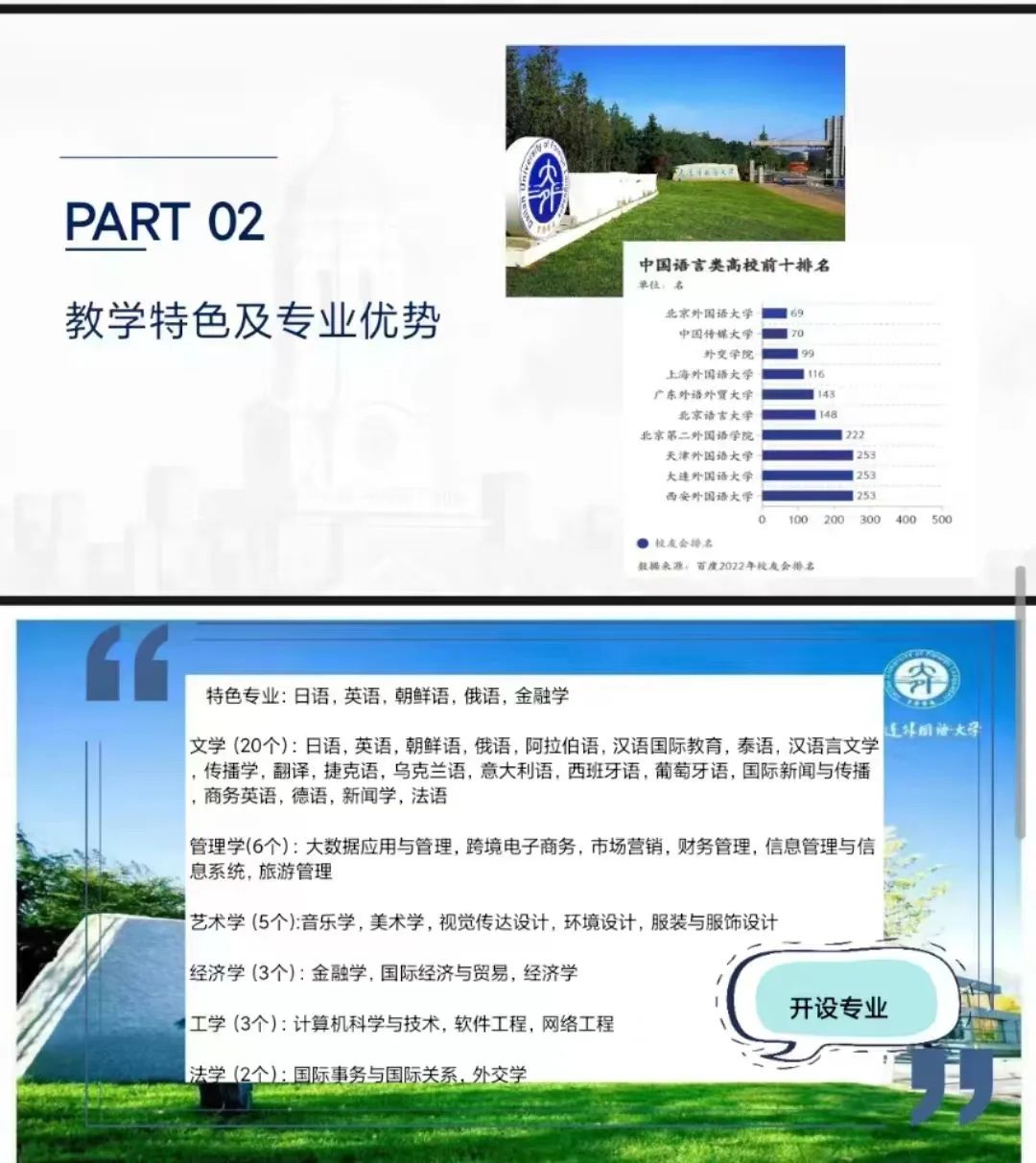 建议宣讲的同学可以从不同角度,不同方面去介绍大外,例如学校的历史背景、地理位置、基础设施建设、师资力量,学校获得的奖项和成就。可以重点介绍特色专业、学科优势,也可以选择学校的部分重点专业进行讲解。希望以后宣讲的同学们,能向更多人描绘出美丽多样,丰富出彩的大外!