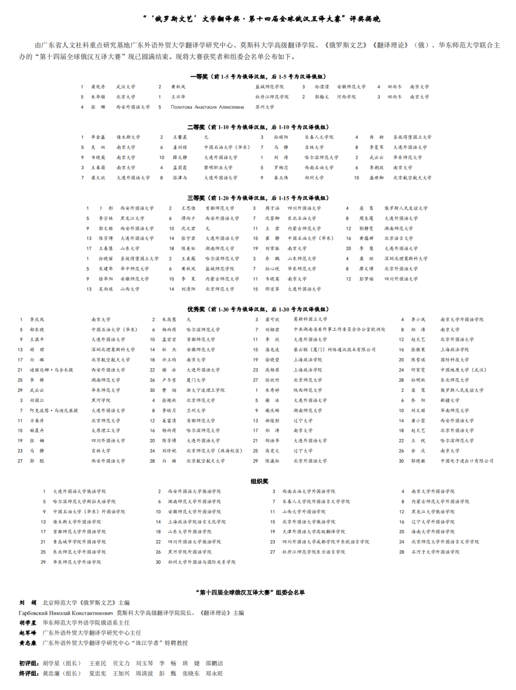 据悉,“俄罗斯文艺”文学翻译奖·第十四届全球俄汉互译大赛是由广东省人文社科重点研究基地广东外语外贸大学翻译学研究中心、莫斯科大学高级翻译学院、《俄罗斯文艺》、《翻译理论》(俄)、华东师范大学联合主办。该赛事至今已连续举办了14届,是我国目前级别和水平最高、参赛人数最多并且在国内外都享有盛誉的权威性俄汉翻译赛事。本次大赛吸引海内外多人参赛,经初评、终评,共评选出一等奖10名,二等奖20名,三等奖35名,优秀奖60名。