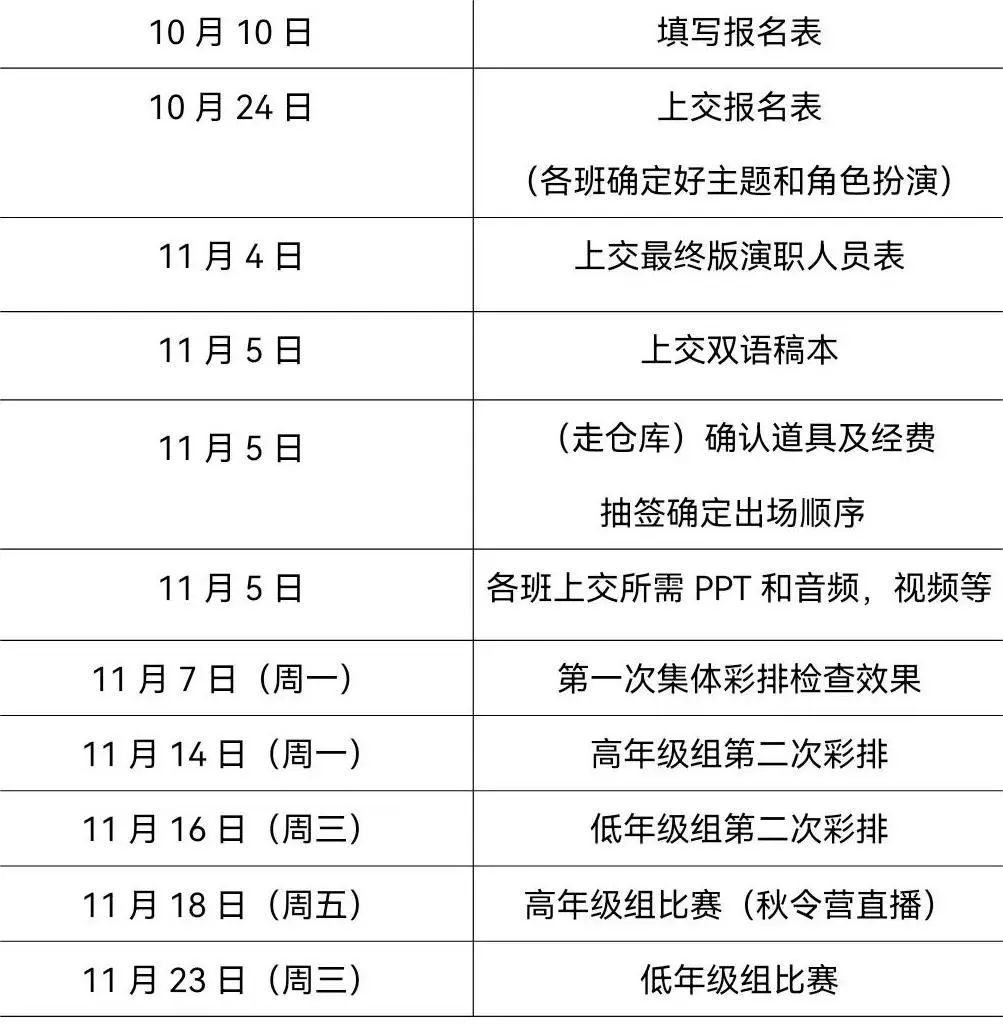 11月7日第一次全体彩排,11月14日高年级组第二次彩排,11月16日低年级组第二次彩排。