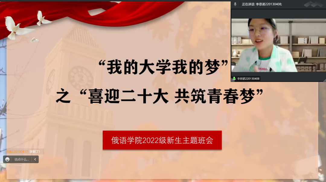 此次我的大学我的梦之“喜迎二十大,共筑青春梦”主题班会通过班导生和新生进行沟通交流,深入引领,引导新生展望大学生活,畅谈大学目标。有益于新生尽快完成身份角色的转变,积极投入进新的学习与生活。希望全体22级新生可以“心怀国之大者,不负韶华、不负青春”!