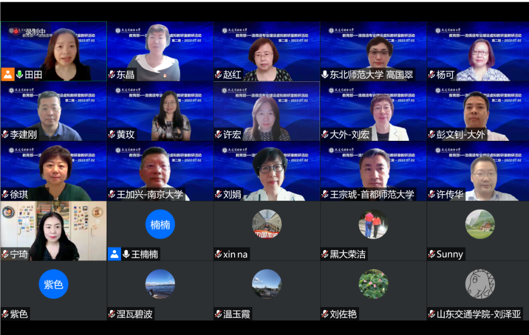 随后,俄语专业虚拟教研室成员高校代表开展了第二期教研活动的交流与研讨。教育部外指委俄语分委会委员、广东外语外贸大学杨可教授以广东外语外贸大学一流俄语专业建设为例,分享了一流俄语专业建设的路径、方法、成效、不足及解决方案。教育部外指委俄语分委会委员、四川外国语大学徐曼琳教授详解了一流俄语专业建设中的难点:师资队伍建设、专业定位及特色优势、专业内涵建设、专业综合改革并提出相关思考。教育部外指委俄语分委会委员、西安外国语大学赵红教授对一流专业建设标准进行了详尽地解释,并以西安外国语大学俄语一流专业建设为例,分析了一流俄语专业建设的重难点及行动方案。北京第二外国语学院许传华教授以北京第二外国语学院一流俄语专业建设为例提出了俄语专业建设中的“内嵌”与“外生”路径,以此推进人才培养机制优化。教育部外指委俄语分委会委员、首都师范大学王宗琥教授探讨了以文化为导向的高素质俄语人才培养的理论、思路及举措,提出了以文化为导向,融知识、能力、素养于一体的教学体系新思路。此外,教育部外指委俄语分委会委员山东大学教授李建刚教授、北京师范大学刘娟教授、南京大学王加兴教授、厦门大学徐琪教授及东北师范大学高国翠教授分别对上述嘉宾的发言进行了精彩点评。