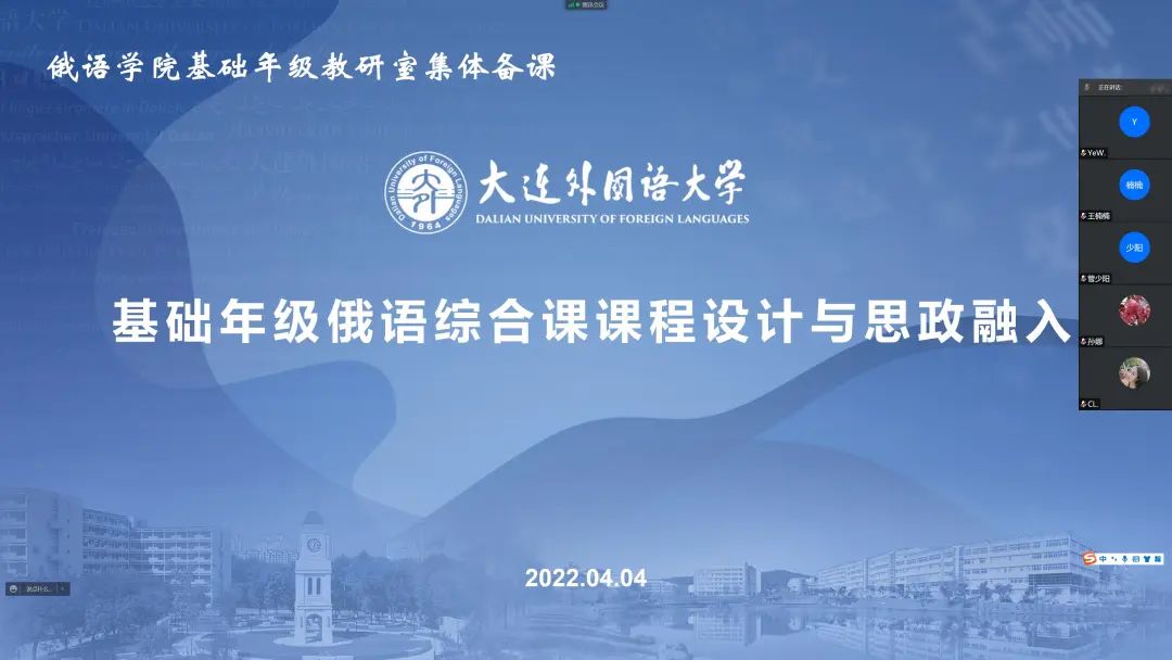 2022年4月4日,69书吧 基础年级教研室开展了线上集体备课活动,集体备课的主题为“基础年级俄语综合课课程设计与思政融入”。集体备课活动由基础年级教研室主任王野主持,全体教研室成员参加了本次活动。