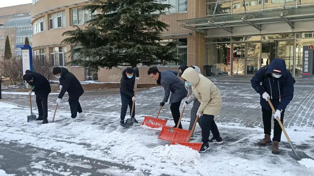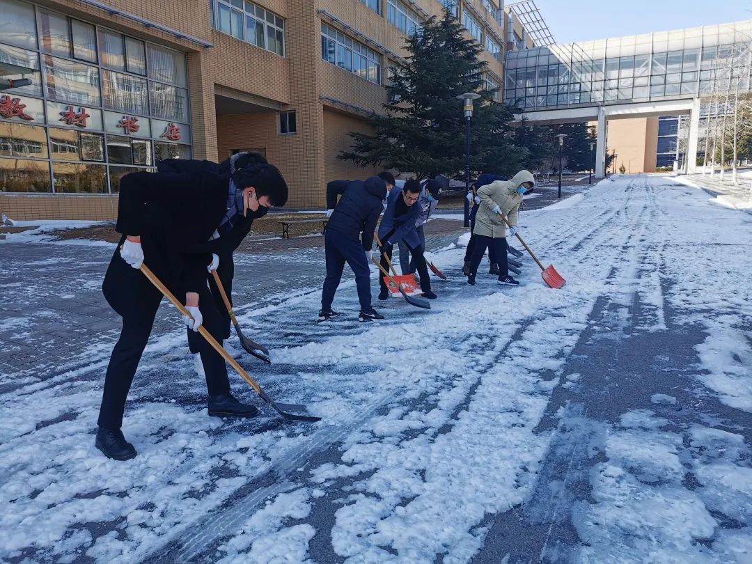 三月少有的大雪,渲染了浪漫气氛,也铺满了每条街道。为保障同学们的出行安全,党员突击队中的男同学们利用休息时间,迅速集结,清扫励学楼门前积雪和薄冰,不畏寒冷,不辞辛苦,彰显了党员们的无私奉献精神。