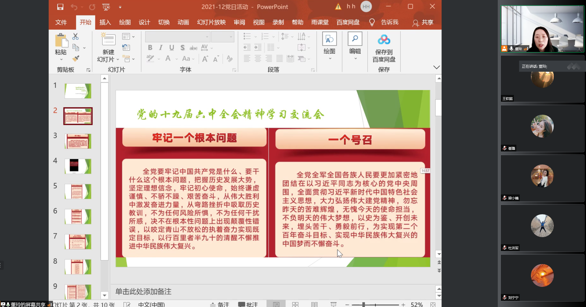 会上,董玲书记首先传达了《中国共产党第十九届中央委员会第六次全体会议公报》和《中共中央关于党的百年奋斗重大成就和历史经验的决议》的主要内容。随后,对中国共产党第十九届中央委员会第六次全体会议精神进行了精读,包括“两个确立”、“马克思主义中国化的三次飞跃”、“四个历史时期,四个伟大飞跃”、“五个方面总结百年奋斗历史意义”等。全体党员深刻领会了六中全会的会议精神,并结合工作实际开展了学习心得交流。