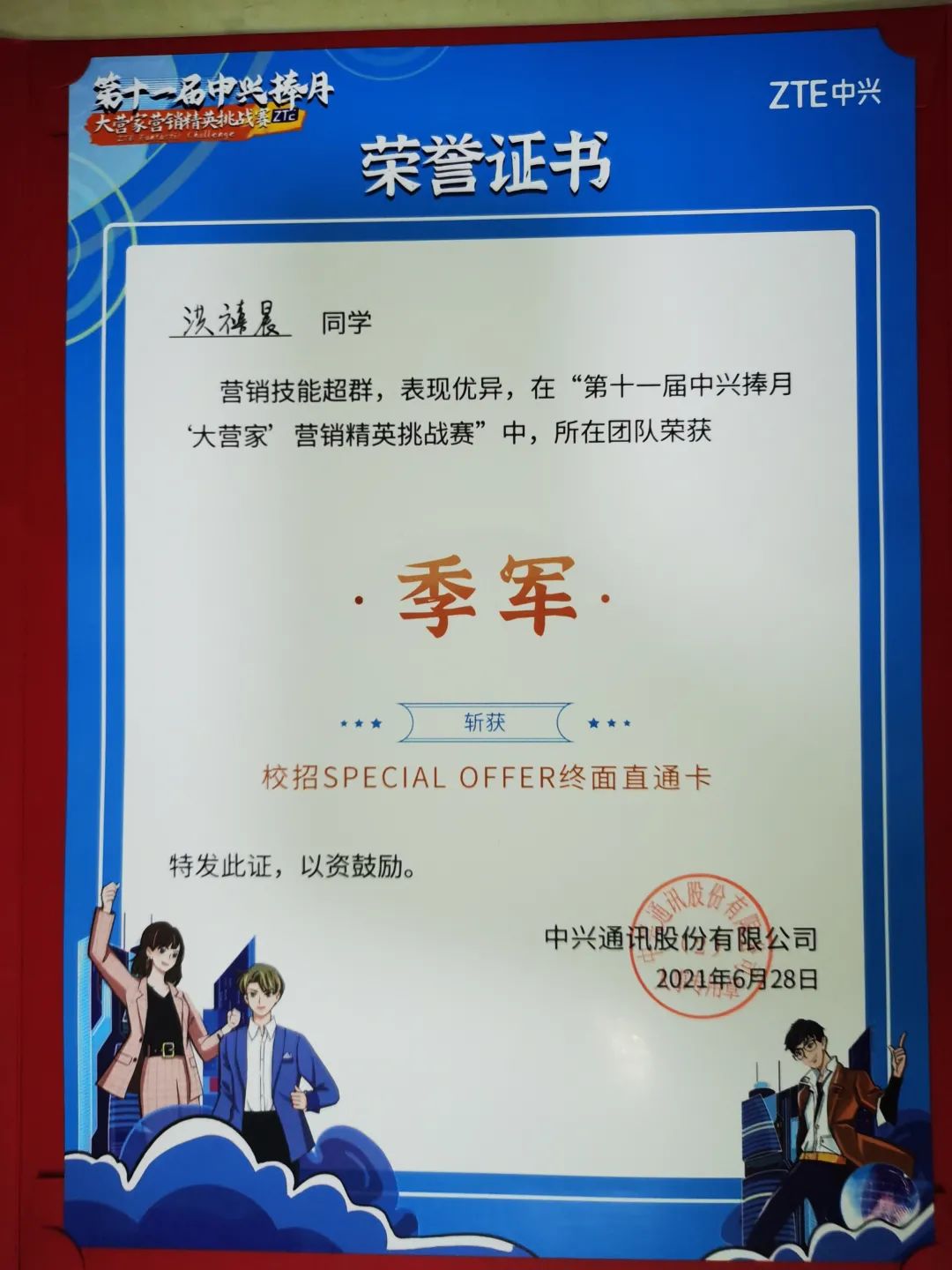 6月25日至6月28日,第十一届“中兴捧月大营家营销精英挑战赛”全球总决赛于西安举行。这一比赛是中兴通讯每年举办的最高规格的大学生比赛,也是全国高校学生参加最多、等级最高、挑战性最大、奖金最丰厚的比赛之一,吸引了近三万名来自清华、北大、港大、复旦、南大、上交等名校本硕博学生参加。69书吧 2018级本科生洪禧晨历经初赛、复赛,成功进入决赛,并获得了全球季军的好成绩,同时收获了六万元的奖金与校招SP offer卡。