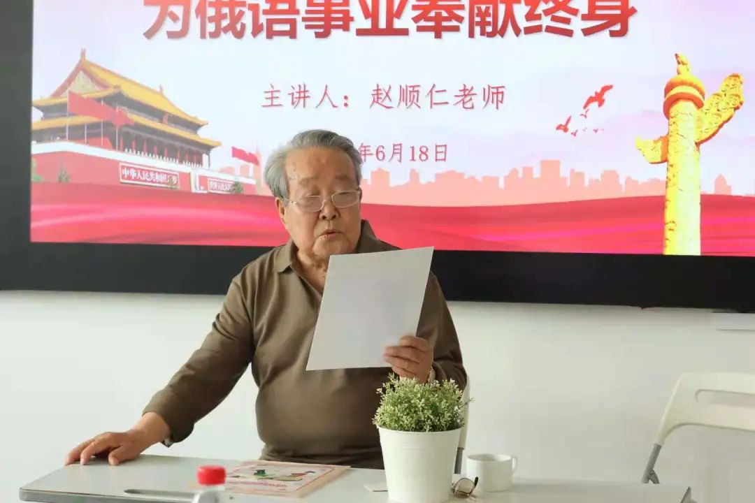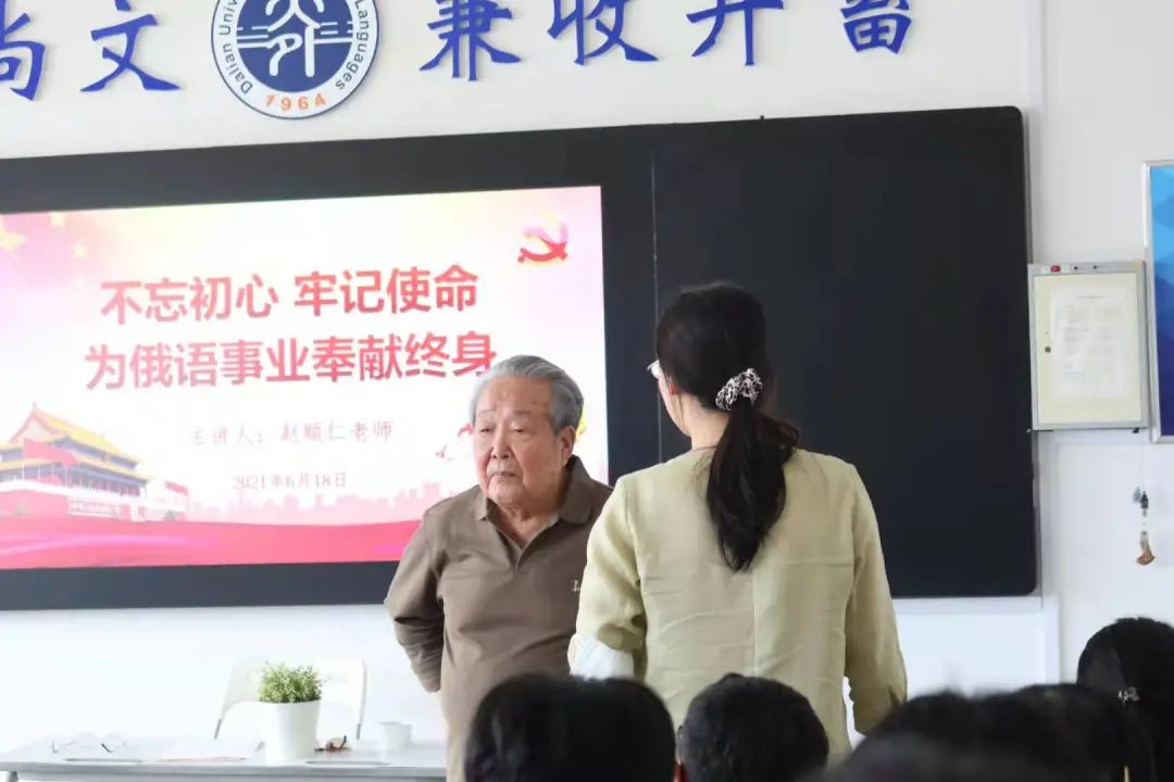 赵顺仁老师入党65年以来,一直坚守自己的工作岗位,为俄语事业做贡献,认真完成党组织交代的各项任务,处处以党员的标准严格要求自己,获得师生的一致认可,多次受到群众的称赞。赵顺仁老师的第一身份始终是党员,第一职责始终是全心全意为人民服务,他的座右铭是:“生命不息,战斗不止!”