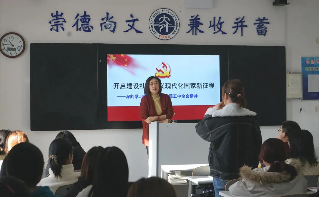 次日上午,学院党总支书记梁小楠以“开启建设社会主义现代化国家新征程-深刻学习领会党的十九届五中全会精神”为主题,强调新青年应勇于承担责任,丰富和提升自己的各项能力,关心国家大事、关注社会发展,以服务祖国、服务社会为豪,明晰文化输出对中华民族伟大复兴的重大意义,勉励同学们带着中国自信传播中华文化。