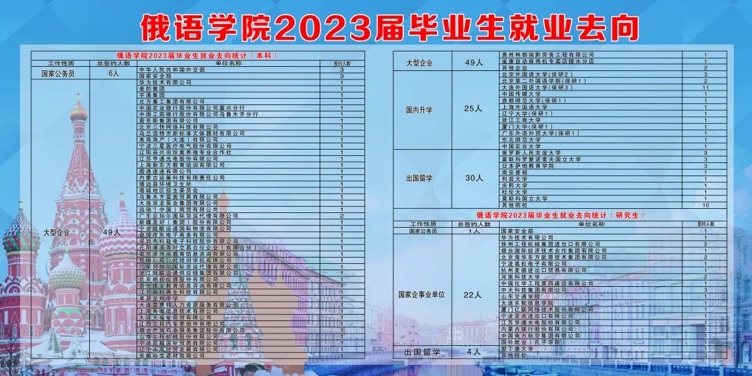 学子活跃在外交部、国安部、国家税务局、各省市外事办、高校等机关事业单位和华为、徐工、中国重汽、中国银联、中交三航局、南航、海航、美的、海尔、海信等知名企业。