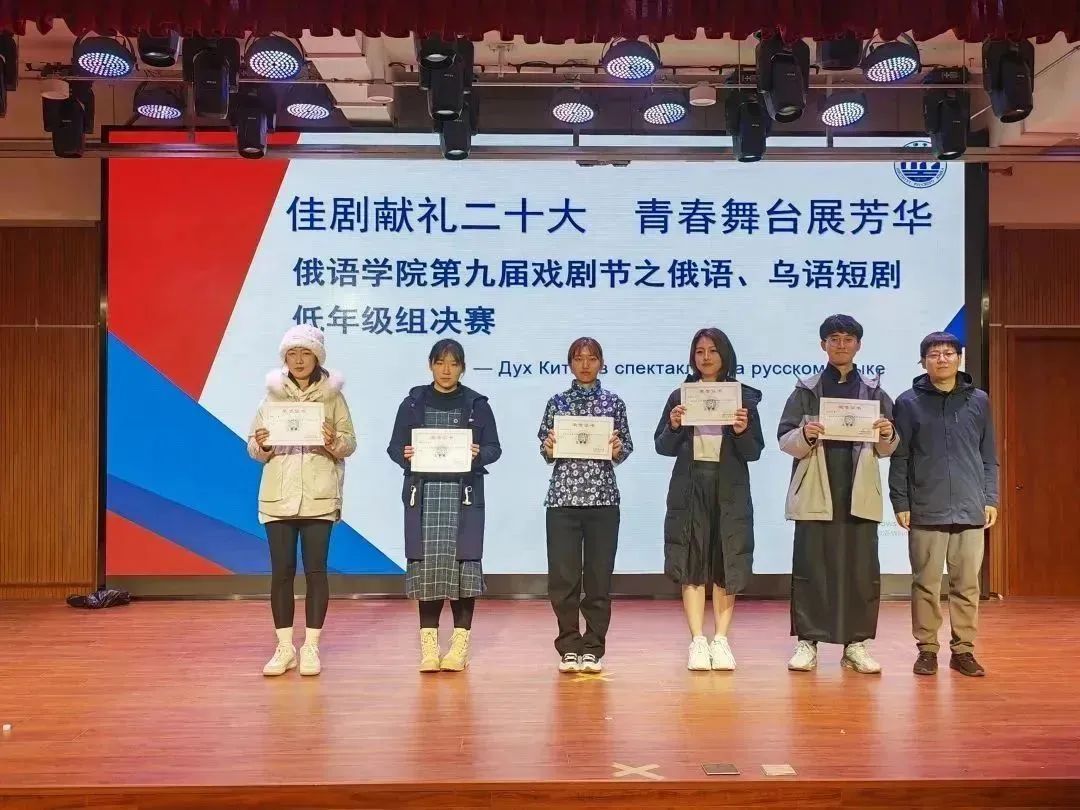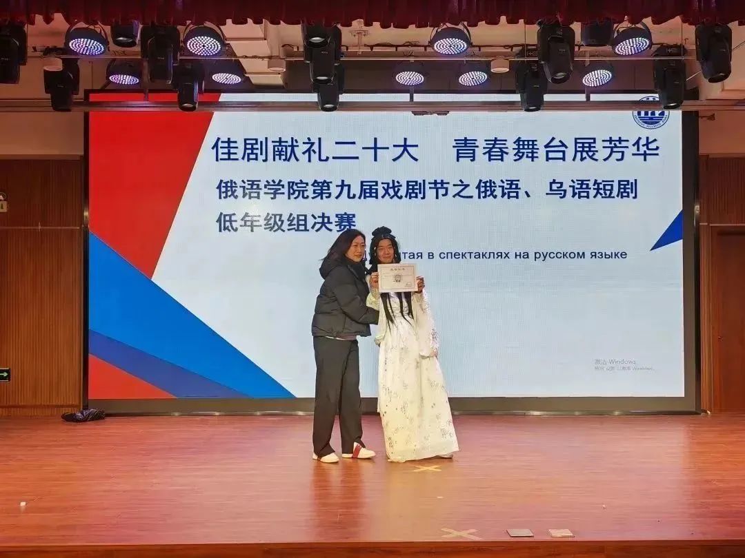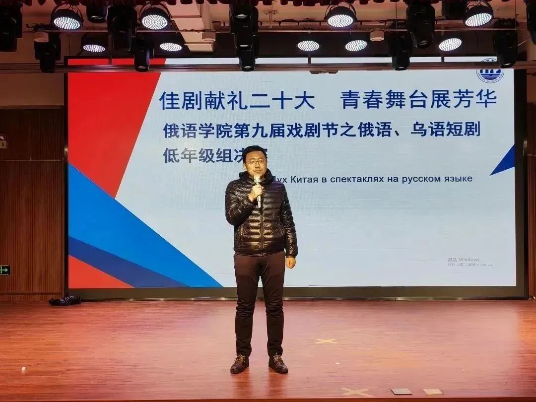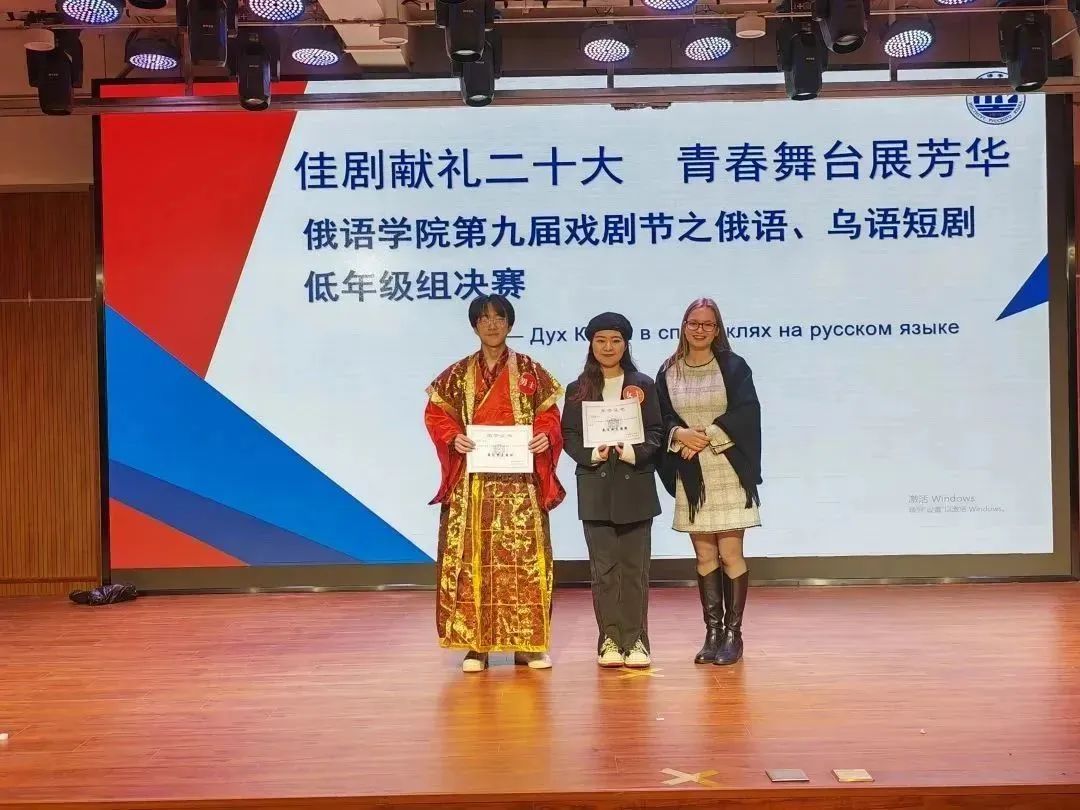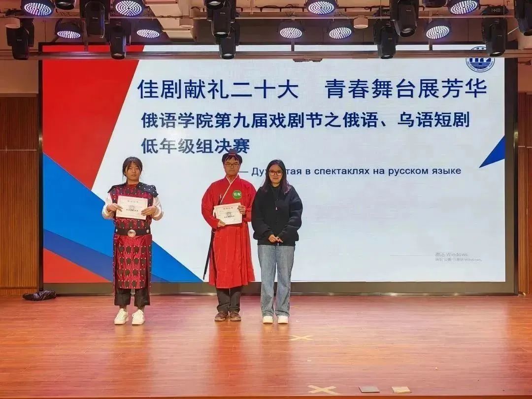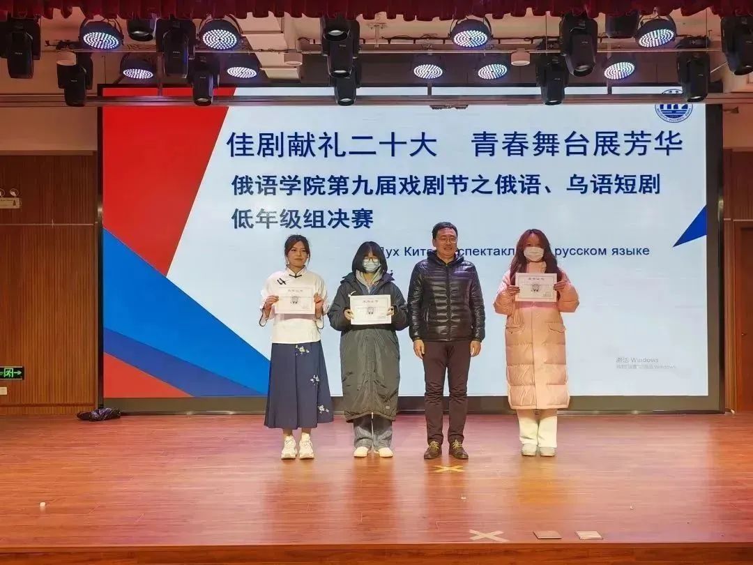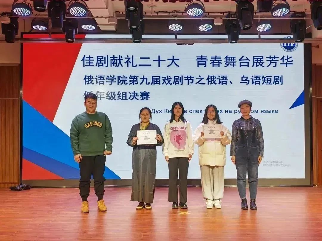 教师娄益华、乌克兰语外教Татьяна Николаевна、辅导员美合日古丽·喀哈尔等老师及研究生代表邵宏第,本科生代表安郑蕾担任评委,与低年级同学们一同观赏本次戏剧节。