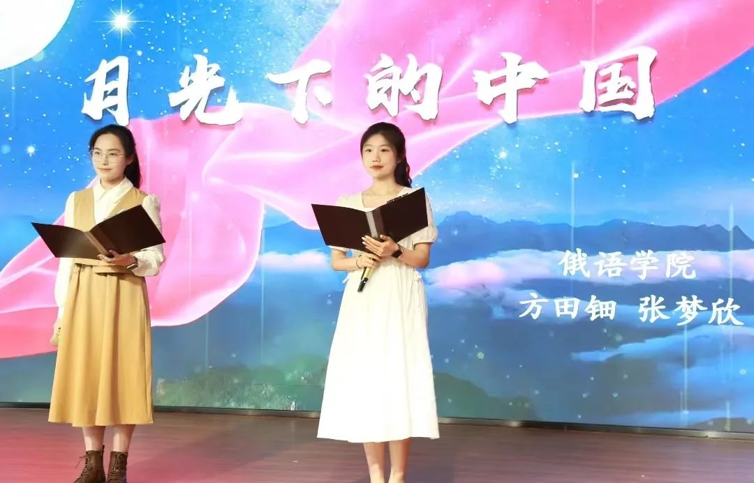第一环节中,方田钿和张梦欣同学给大家带来了诗朗诵《月光下的中国》。这首诗来源于诗人欧震,整篇诗歌通过对祖国大好河山、悠久的历史的描写,表达出作者对祖国的热爱与深深的赤子情怀。两位同学情绪饱满、感情真挚,将诗人的爱国情怀倾泻得淋漓尽致,最终以第二名的成绩晋级第二环节。