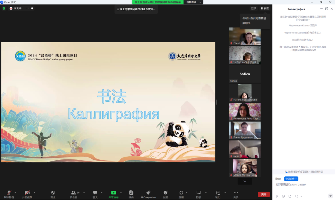 “汉语桥”线上团组项目——云端上的中国“风”“味”2024项目为期5天。今年恰逢“中俄文化年”和我校建校60周年,本次项目在推动了中俄文化交流的同时也激发了俄罗斯学生学习中文的热情,让外国学生体会汉语及中华优秀文化的魅力,为弘扬中华智慧,传播中华优秀文化奠定了良好基础。