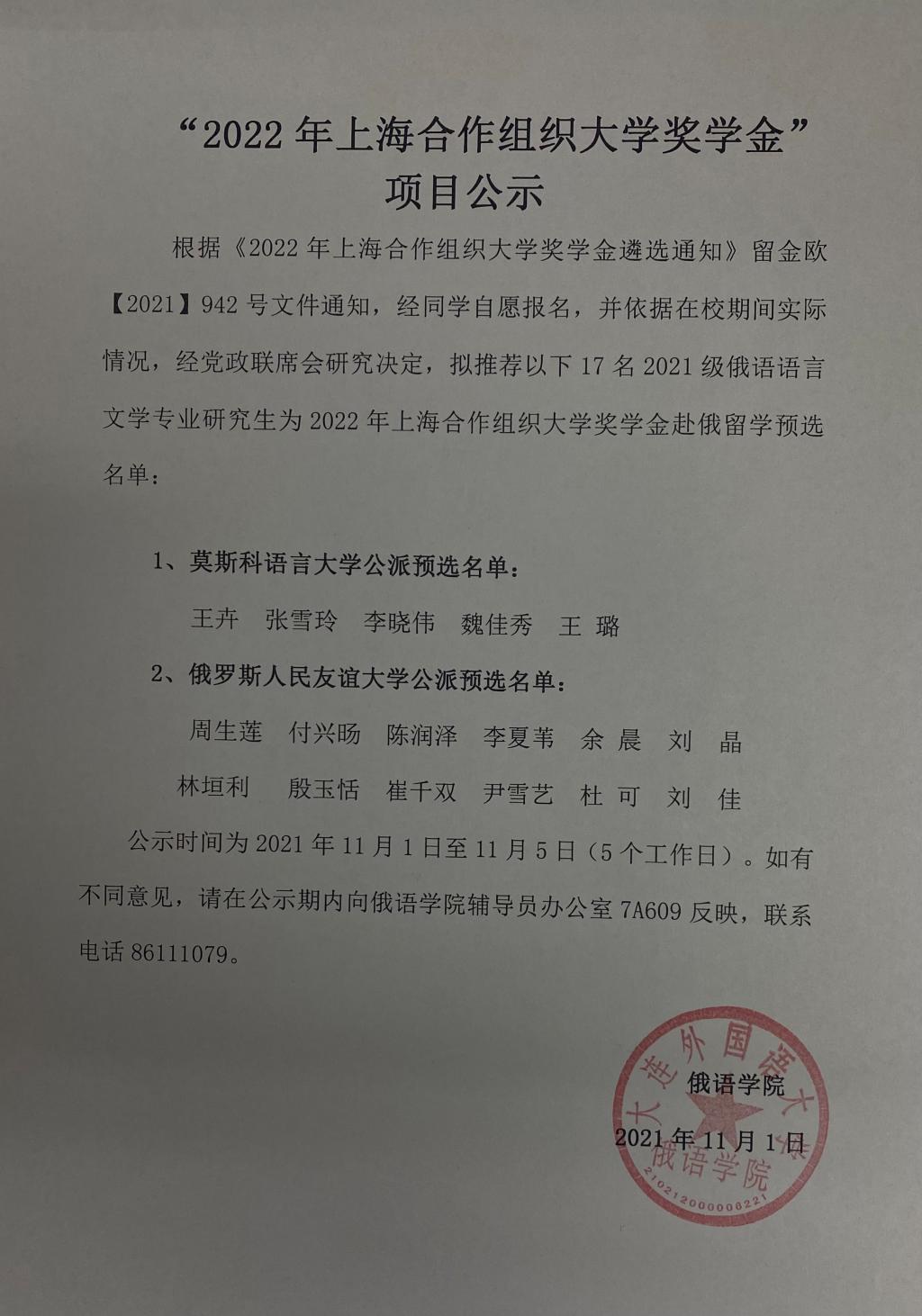 2020级3+1“2022年中俄政府奖学金”项目公示