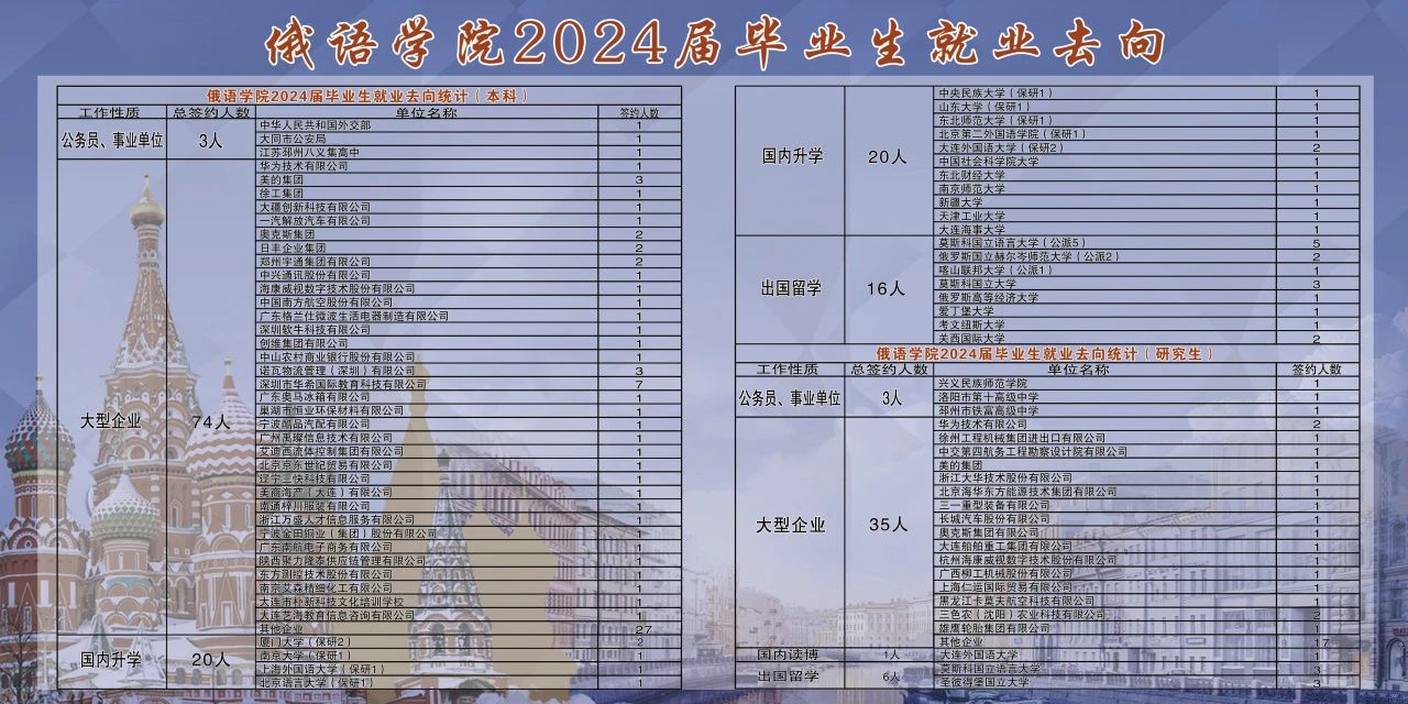 学子活跃在外交部、国安部、国家税务局、各省市外事办、高校等机关事业单位和华为、徐工、中国重汽、中国银联、中交三航局、南航、海航、美的、海尔、海信等知名企业。