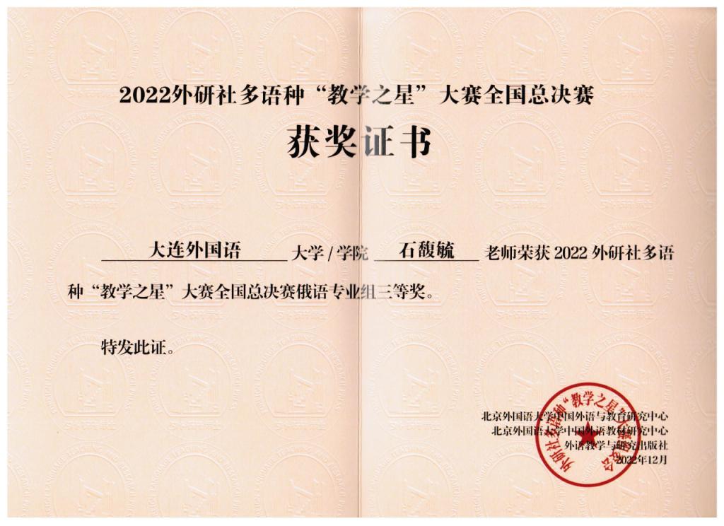 教师李瑞莲在2018外研社多语种“教学之星”大赛全国总决赛中获得俄语组亚军