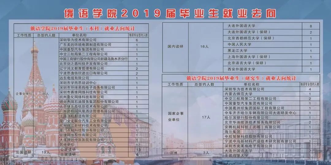学子活跃在外交部、国安部、国家税务局、各省市外事办、高校等机关事业单位和华为、徐工、中国重汽、中国银联、中交三航局、南航、海航、美的、海尔、海信等知名企业。