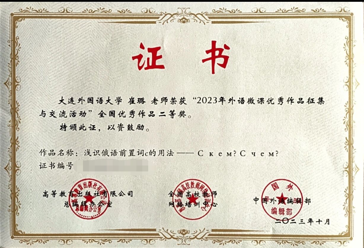 学生获2017年全国高校俄语大赛低年级组一等奖
